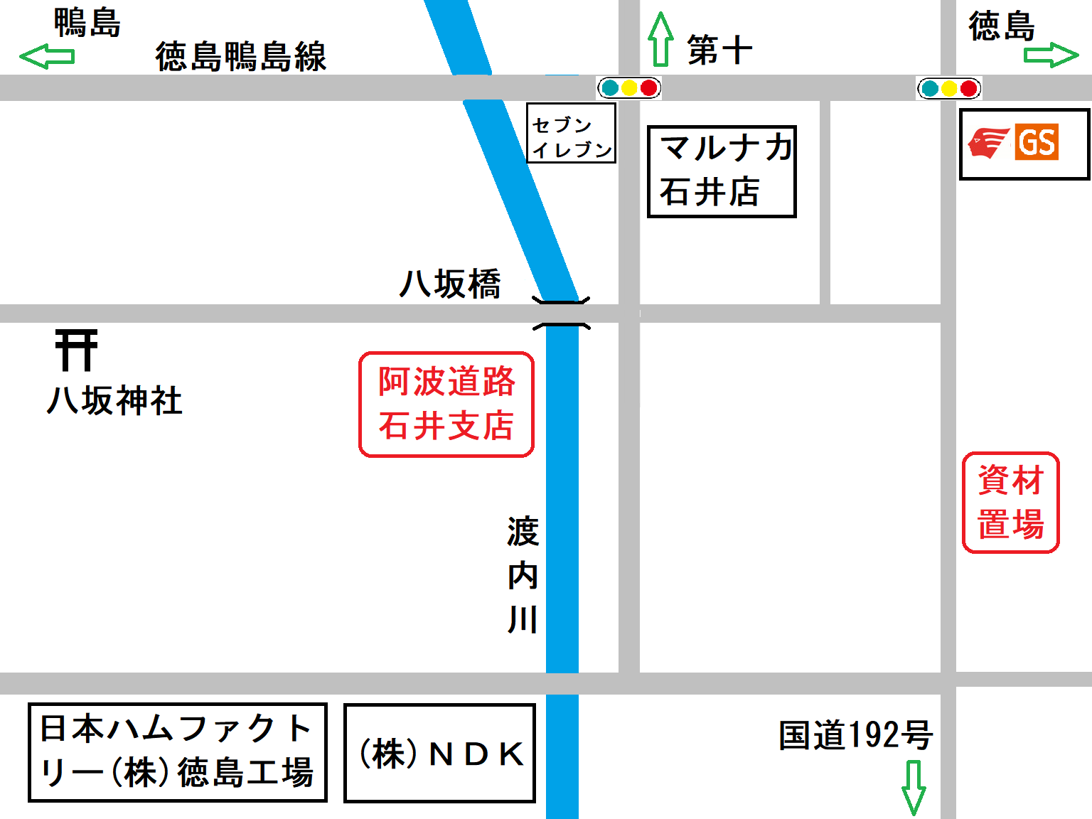 鳴門本社周辺地図 阿波道路本社 〒771-0630 徳島県鳴門市瀬戸町明神字馬越26番地1 アクセス(自動車の場合) 鳴門駅より北へ、ボートレース鳴門前を通過、県道を西へ6km(所要時間約10分) 石井支店周辺地図 阿波道路石井支店 〒779-3223 徳島県名西郡石井町高川原字高川原1696番地1 アクセス(自動車の場合) フジグラン石井店より東へ1.5km(所要時間約3分)